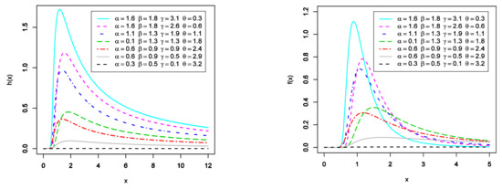 The plots of HRF (left panel) and PDF (right panel) for EGIG with different choices of , , , and .