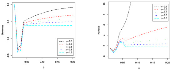 where represents the quantiles of . Figure 2 illustrates the plots of and for various choices of as and . It shows that the EGIG is suitable for modeling the negative and positive skewness, and also both and are sensitive to the shape parameters and .