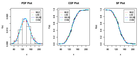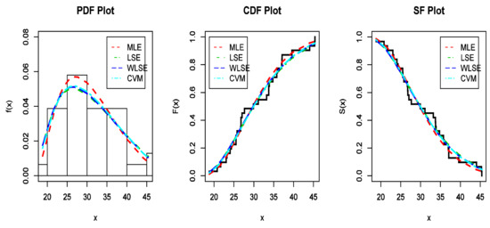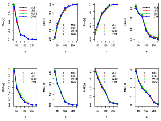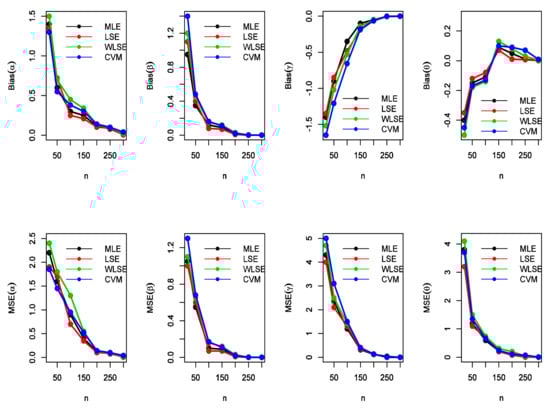 The first simulation performed is repeated n = 300 times. The sample sizes used here are and . The parameter values are , , , Figure 3 displays the simulation results, which verify that the estimated MSEs and biases decrease when the sample sizes are increased. That is, the MLE, LSE, WLSE, and CVME approaches can be used effectively to estimate the model parameters for different sample size. This confirms the consistency property for the MLEs, LSEs, WLSEs, and CVMEs when n grows.