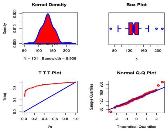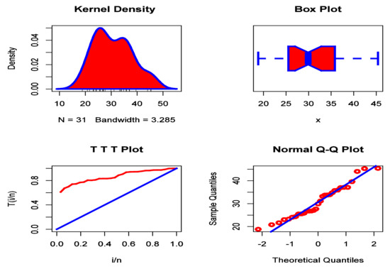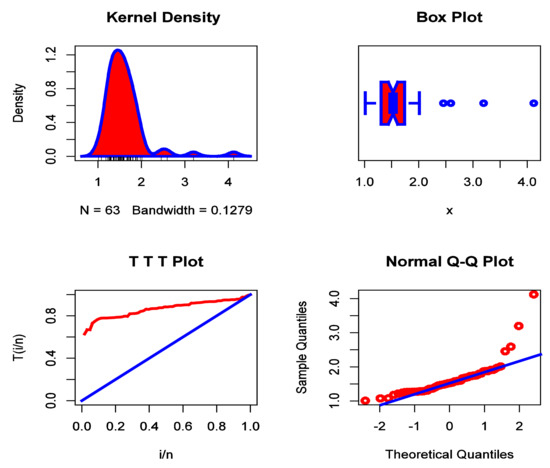 The KDE plot, box plot, TTT plot, and Q–Q plot for the data set I.