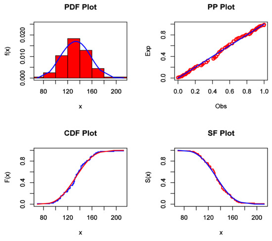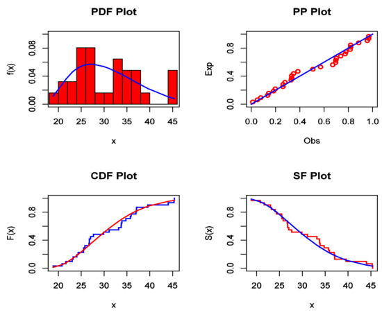 By differentiating Equation (36) for and and equating it to zero, we will obtain a non-linear system of equations that are solved numerically to find and The record data studied here are mentioned by [30] and represents the lifetimes to breakdown for a sample of 11 electric isolating fluids exposed to 30 kilovolts. The data considered here are 2.836, 3.120, 3.045, 5.169, 4.934, 4.970, 3.018, 3.770, 5.272, 3.856, and 2.046. The upper record values of these data are 2.836, 3.120, 5.169, and 5.272. The MLEs, –L, KS, and p-values for the A, IG, EGA, and EGIG distributions are listed in Table 10. The EGIG has the smallest –L and K-S values and the largest p-value, and this result confirms that the EGIG fits data set V better than the A, IG and EGA models.