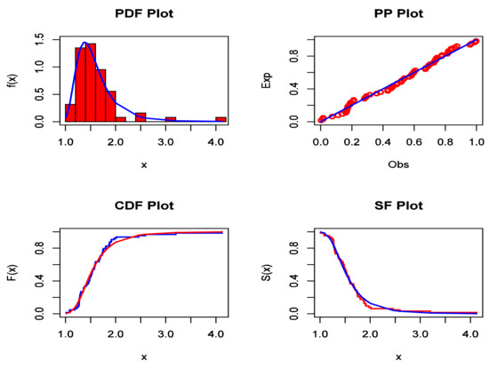 The estimated PDF, P–P plot, estimated CDF, and estimated SF for data set I.