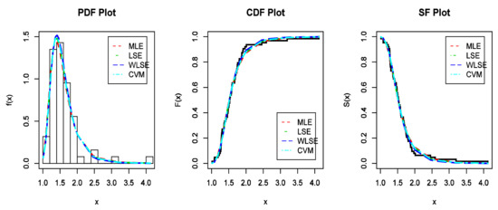 Figure 5 shows the nonparametric Kernel density estimation (KDE) plot, the box plot, the total time test (TTT) plot, and the quantile–quantile (Q–Q) plot. The initial shape of data set I can be explored by the KDE plot, and it is noted that the KDE plot for data set I appears to be nearly symmetric. The extreme values of data set I can be explored by the box plot, and it is noted that no extreme values were found, and the Q–Q plot emphasizes this result. The empirical HRF of data set I can be explored by the TTT plot, and it is noted that the empirical HRF appears to be monotonically increasing. Figure 6 gives the estimated PDF, probability–probability (P–P) plot, estimated CDF, and estimated survival function (SF) for the first data set. Table 2 presents the MLE, LSE, WLSE, and CVM estimators, K-S test statistic and the p-values for the EGIG, and it is found that the WLSE method is the best one to estimate the EGIG parameters because it has the smallest K-S value and the largest p-value. Figure 7 introduces the estimated PDFs, estimated CDFs, and the estimated SFs for the first data set using the estimators in Table 2. The values of the LRT (), degree of freedom (), and the corresponding p-values for the first data set are presented in Table 3. According to the p-values, it is clear that the null hypothesis () is rejected at .