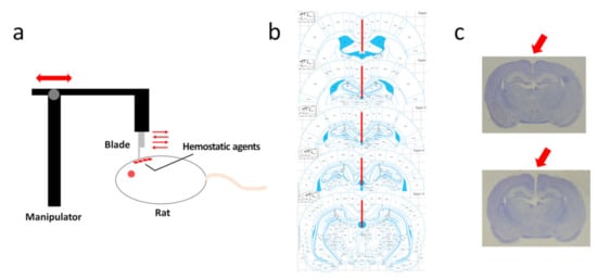 (a) Schematic diagram of the surgery. The blade was moved back and forth twice, and hemostatic agents were used to handling the bleeding. (b) The area through which the blade passed. The red line indicates the cut area. There was little or no difference in the size of the cut area among individuals. The brain atlas shows, from top to bottom, AP = −1.08, AP = −2.04, AP = −3.00, AP = −4.08, AP = −5.04. (c) Images of sections showing the cutting site (the red arrowhead) for the sham group (top) and the cut group (bottom).