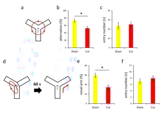 The SAT (Figure 2a) and the NPT (Figure 2d) were used to measure short-term memory. In the SAT, the one-way ANOVA showed a significant effect for the alternation rate (both n = 9, F(1, 16) = 10.31, P = 0.0054), and the cut group was significantly lower than that for the sham group (Figure 2b). On the other hand, the one-way ANOVA showed no significant effect for the entry number (both n = 9, F(1, 16) = 0.090, P = 0.77) (Figure 2c). In the NPT, the one-way ANOVA showed a significant effect for the Novel arm rate (both n = 9, F(1, 16) = 15.62, P = 0.0017), and the cut group was significantly lower than that for the sham group (Figure 2e). On the other hand, the one-way ANOVA showed no significant effect for the entry number (both n = 9, F(1, 16) = 16.00, P = 0.42) (Figure 2f).