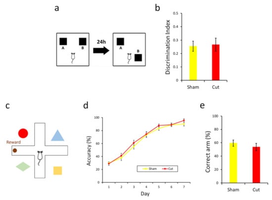 The results of long-term memory tasks. (a) Experimental apparatus used in the OLT. (b) Discrimination Index based on the novel location rate in the OLT. (c) Experimental apparatus used in the PMT. (d) Accuracy on days 1–7 in the PMT. (e) Correct arm rate on day 8 in the PMT. Yellow and red bars represent the sham group (n = 9) and the cut group (n = 9), respectively. All measures are shown as means ± SEM. OLT, object location test; PMT, plus-maze test.