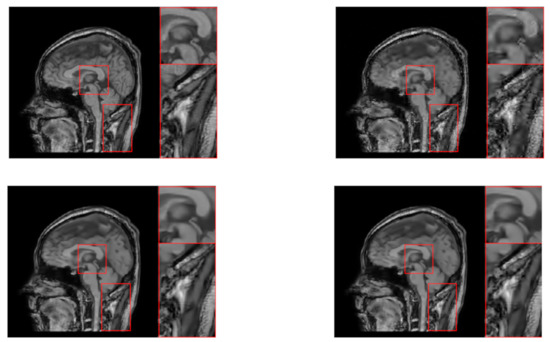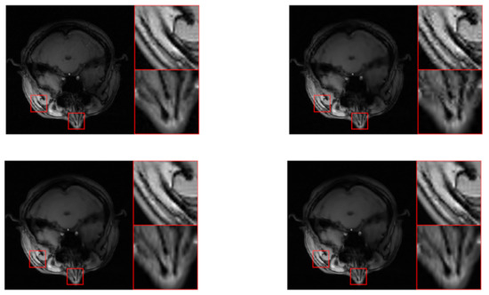 The tomographic results for the image “brain”. (top left) True data and local detail area for comparison; (top right) the restored image by SRD-DDTF method [5]; (top right) the restored image by NLR-DDTF method with ; (bottom right) the restored image by NLR-DDTF method with .