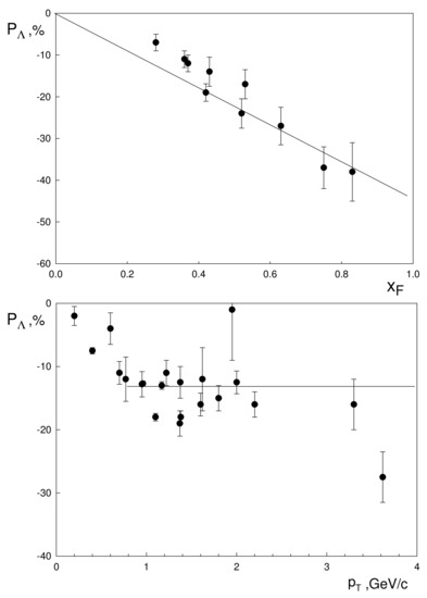 Experimental results from measurements of hyperon polarization at different energies are widely known [3]—they are stable for a long time and are well documented. The polarization of produced in unpolarized inclusive -collisions is negative (it is perpendicular to the production plane and is directed opposite to the normal of this plane) and energy-independent. It increases linearly with at large transverse momenta ( GeV/c), and for such values of transverse momenta, it is almost -independent. A comprehensive review of the experimental situation is given in [3]. It should be noted that the above results are for hyperons, which appear to be protons’ fragmentation products.