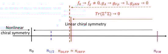 The proposed schematic phase structure for density regimes: stands for equilibrium nuclear matter density, for onset density of half-skyrmions, for dilaton limit fixed point, for IR fixed point and for vector manifestation fixed point.