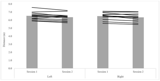 All data were initially recorded as means and standard deviations (SD) in Microsoft Excel. Normality of the data was confirmed using the Shapiro–Wilk test (p > 0.05). Within- and between-session reliability were computed using the coefficient of variation (CV), which was calculated as (SD/average)*100 and a two-way random intraclass correlation coefficient (ICC) with 95% confidence intervals (CI). Intrarater reliability was also calculated for 6 participants from session 1 to ensure consistency in the manual detection of raw data, noting that this totaled to 36 individual hops being analyzed for flight time and 24 individual hops for all other metrics. CV values < 10% were deemed acceptable (3) and ICC values were interpreted in line with suggestions by Koo and Li [8], where >0.90 = excellent; 0.75–0.90 = good; 0.50–0.74 = moderate; and <0.50 = poor. The magnitude of asymmetry was calculated based on suggestions by Bishop et al. [36,37] using Equation (2).