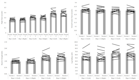 Mean and individual test scores for flight time (top left), ground contact time (top right), reactive strength index (bottom left), and leg stiffness (bottom right) during the triple hop test in both test sessions.