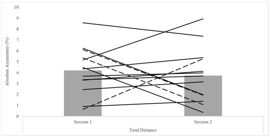 Mean and individual asymmetry scores for the total distance during the triple hop test in both test sessions. Note: dashed lines indicate a change in asymmetry greater than the CV in test session 1.