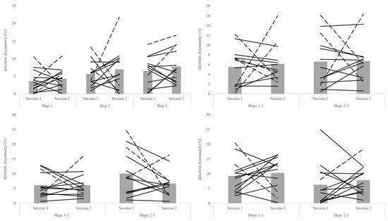 Table 3 shows data for the magnitude of asymmetry in both test sessions. All differences in the magnitude of asymmetry were trivial (g ≤ 0.35), with the exception of RSI between the first two hops (g = 0.43). This provides the impression that the magnitude of asymmetry is consistent between test sessions. However, it is important to note the large SD values, relative to the mean asymmetry score, which highlights large within-group variation. As such, this likely precludes any meaningful differences from being determined between test sessions, which has been acknowledged in previous asymmetry studies [6,12]. Consequently, previous studies have suggested analyzing asymmetry data on an individual basis [40], hence the inclusion of Figure 2, which shows the large spread of individual asymmetry values for each metric. This is magnified further when compared to Figure 1, which shows that the spread of individual values is considerably less for raw jump metrics. Thus, although only trivial-to-small differences were evident in the magnitude of asymmetry, individual changes were sometimes quite extreme, supporting the notion of analyzing asymmetry data on an individual basis. When assessing whether real asymmetries were present, no athlete consistently exhibited real asymmetries between hops or metrics, highlighting the highly individualized and variable nature of asymmetry. This is also supported in previous research by Bishop et al. [28], who reported similar individual inconsistencies for changes in asymmetry during a competitive season in academy soccer players. As such, the data from the present study and Bishop et al. [28] indicate that an athlete being fatigued or rested may have little impact on the consistency of asymmetry being greater than the test variability score.