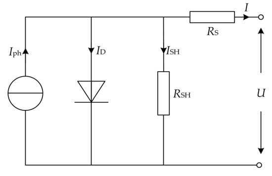 The spectral distribution and sunlight irradiance will directly affect the output current and voltage of solar cells, thus affecting the output power of solar cells. When sunlight shines on the surface of the solar cell, it can be regarded as a current source, and the equivalent circuit is shown in Figure 1. In the figure, the photogenerated current Iph is generated by the solar cell under illumination, which is affected by the cell material, illumination intensity, and ambient temperature. ID represents the reverse saturation current of the diode. RSH is the bleeder resistance, and RS is the series resistance, which contains the resistance between two electrodes, the surface resistance, and the body resistance.