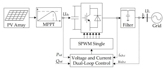 The voltage level for single solar cell is low, which is not enough to meet the grid connection requirement. Therefore, multiple solar cells need to be connected in series to increase the voltage to meet the grid connection requirement, and multiple solar cells in series can form the PV power generation unit to obtain higher power by parallel connection. Furthermore, with the continuous scale expansion of PV generation, the mismatch between load and source characteristics for solar cells will cause a significant power loss [23]. Thus, maximum power point tracking (MPPT) technique has become the main control method with respect to maximum power at present [23,24]. The MPPT algorithm features few hardware requirements and simple maintenance. Its implementation mainly depends on a specific microcontroller, which is programmed to generate the duty cycle required to reach the maximum power point and control the boost circuit. The control system model for PV generation is shown in Figure 2. In the figure, sinusoidal pulse width modulation (SPWM) is employed, and it is the most widely used modulation method in photovoltaic inverters.