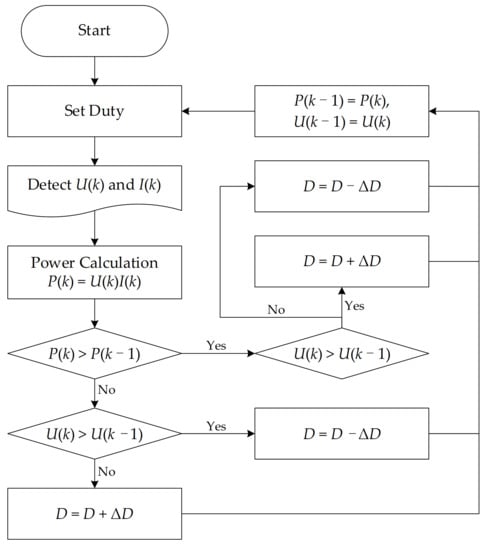 The main MPPT algorithms include constant voltage method, pilot cell method, look up table method, perturb and observe (P&O) method, etc. Among these, the P&O method is the most widely used algorithm in engineering [23,24], and the flowchart is shown in Figure 3. In the figure, U(k) and I(k) are respectively the voltage and current of the kth recording time, and P(k) is the power of the kth recording time. D is the duty ratio, and ΔD is the adjustment quantity of duty ratio.