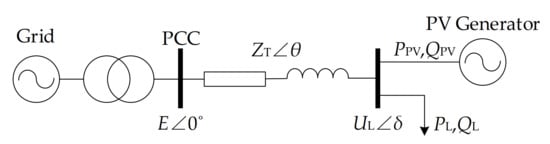 The simplified equivalent circuit for distribution system with distributed photovoltaic generator connected is shown in Figure 6. In the equivalent circuit, E∠0˚ and UL∠δ represent the bus voltage of point of common coupling (PCC) and PV access bus. ZT∠θ is the equivalent branch impedance. PPV and QPV are respectively the active and reactive powers of PV generator, PL and QL are respectively the active and reactive powers of load.