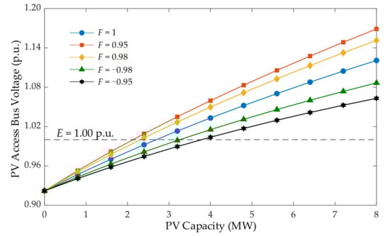 Moreover, it can be seen that when active and reactive powers have the opposite change trends for by adjusting ΔQ, the bus voltage violation and fluctuation can be suppressed which is caused by the change of active power ΔP. Under the condition of given load capacity, the voltage variation trend of PV access bus caused by the change of photovoltaic capacity is shown in Figure 7, and the curves in Figure 7 are calculated for the fixed load.