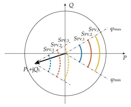 Currently, the photovoltaic inverter has certain reactive power regulation ability so that it can absorb or deliver reactive power, according to the current voltage situation of the PV access bus [15,16], as shown in Figure 8. In the figure, SPV,1, SPV,2, and SPV,3 represent the apparent power of photovoltaic inverters with different capacities, respectively. φ is the power factor angle, and power factor F = cosφ. φmax and φmin represent the maximum and minimum allowable power factor angle φ of photovoltaic inverter.