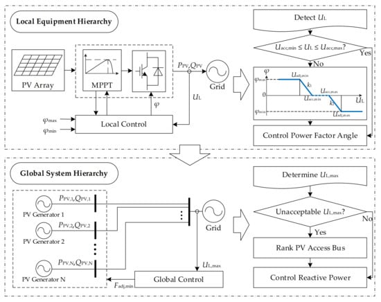 However, when some photovoltaic generators are affected by clouds, shadows, etc., it will affect the output of the PV power supply, resulting in the bus voltage reduction of the PV access bus. At this time, the influence on the bus voltage with the highest value may be relatively small. If only the local control of photovoltaic inverter is adopted, the reactive power absorbed by the photovoltaic generator will be reduced, which may further increase the maximum bus voltage in the system. Furthermore, the global voltage control measure is introduced to reduce the high-penetration and partial shading influences on system voltage violation and fluctuation. Consequently, a double-hierarchical voltage violation and fluctuation suppression strategy for a distributed PV integrated system is proposed in the paper. The framework of the suppression strategy is shown in Figure 9. Four bus voltage reference values are set in the proposal, including maximum and minimum acceptable voltages Uacc,max and Uacc,min, and maximum and minimum adjustable voltages Uadj,max and Uadj,min. k1 and k2 are the adjust slopes for power factor angle φ, as shown in Figure 9. It should be noted that different setting parameters may have different improvement effects.
