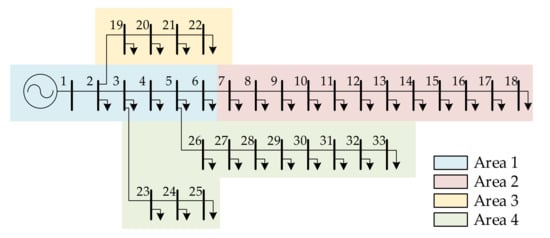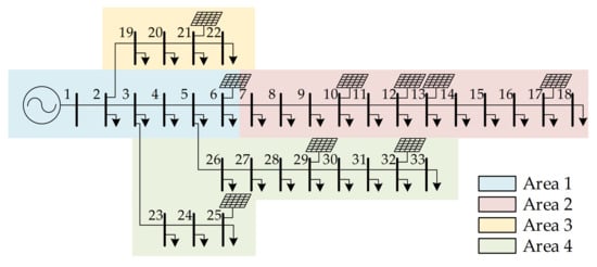The IEEE 33-bus distribution system is used as the test case [25], as shown in Figure 10. In the system, Bus 1 is set to the balance node and the other buses are set to PQ nodes. The distribution system is divided into four areas to further analyze the influence of partial shading.