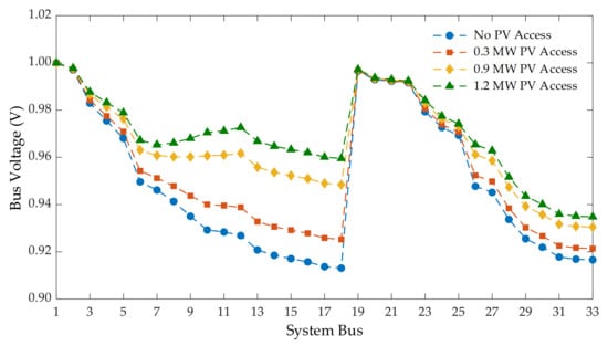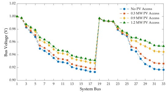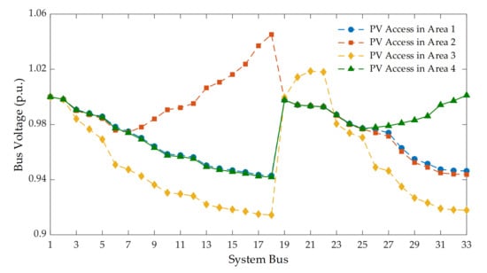 In addition, in order to analyze the influence of partial shadow in different areas on system voltage violation and fluctuation, photovoltaic generator is connected to the end bus of each area—i.e., Buses 6, 18, 22, and 33—with the same capacity of 2 MW. Under different photovoltaic access locations, the comparison of voltage values of all buses in the distribution system is shown in Figure 16.