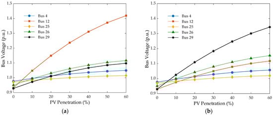 Voltage variations of different buses with PV permeability: (a) PV access in Bus 12; (b) PV access in Bus 29.