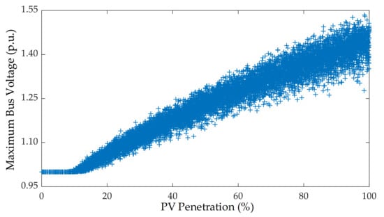 In practice, the photovoltaic location and capacity configurations may be different. To obtain the maximum photovoltaic power generation capacity that the distribution system can accommodate under the condition that the voltage does not exceed the limit, the capacity of all photovoltaic access buses is randomly allocated. In the random process, the uniform distribution is used in assignment of PV capacity, and the change of the maximum bus voltage in the distribution system is observed, as shown in Figure 14.