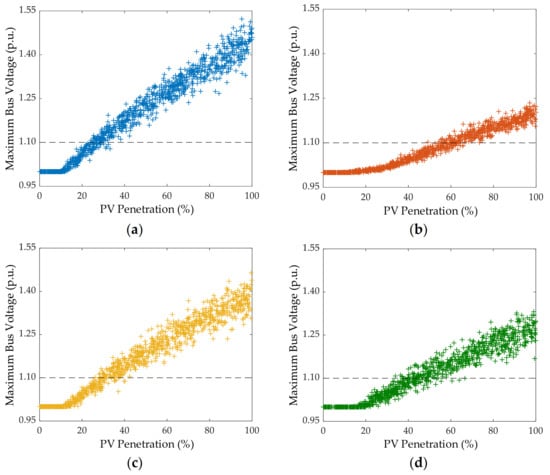 Maximum voltage variations with PV penetration under different output conditions: (a) Maximum voltage variations of Case 1; (b) Maximum voltage variations of Case 2; (c) Maximum voltage variations of Case 3; (d) Maximum voltage variations of Case 4.