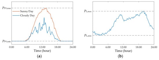 In order to verify the effectiveness of the proposed strategy in the paper, the field measured photovoltaic output and residential load powers in Shandong Province somewhere are employed for analysis, and the photovoltaic output and residential load powers are recorded every 15 min. Figure 17a shows the measured photovoltaic output power curves of a typical sunny day and a typical cloudy day, and Figure 17b shows the residential load power on a typical working day. In the figure, PPV,max and PPV,min are the maximum and minimum photovoltaic output powers, respectively, and the minimum output power PPV,min is 0. PL,max and PL,min are respectively the maximum and minimum powers of residential load.