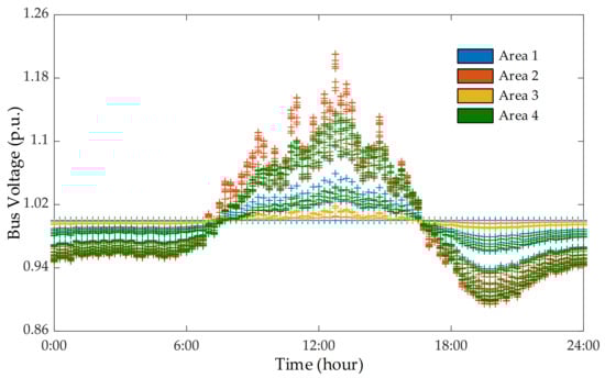 The proposed voltage violation and fluctuation strategy in the paper is then applied to the distribution system, and the bus voltage of each area in one day by employing the proposed method is shown in Figure 20.
