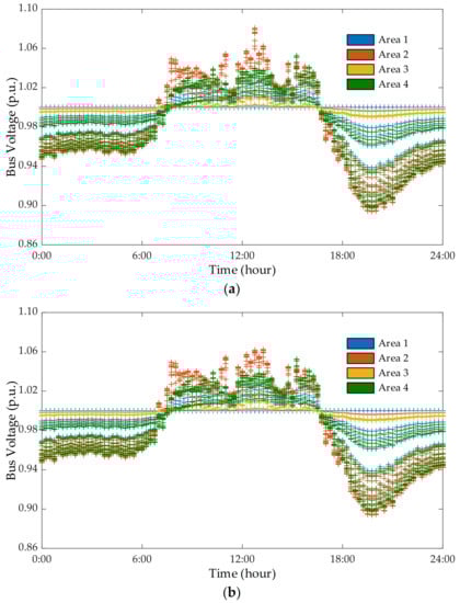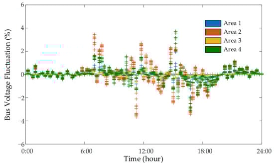 As shown in the figure, the obvious voltage violation and fluctuation in the system mainly appears in Area 2 and Area 4. Bus voltage violation occurs in 21 buses, more than 60%. At about the time of 13:00, due to the peak photovoltaic output, the system bus voltage exceeded the limit seriously, up to about 1.20 p.u. According to the relevant standard of the allowable voltage range in distribution network, the voltage at noontime has seriously exceeded the allowable range. Meanwhile, in the time period of 11:00 to 15:00, the voltage difference at each measured time is relatively large, which will cause serious voltage violation and fluctuation. At about the time of 20:00—that is, the photovoltaic output is zero and the load power consumption reaches the peak value—the voltage shortage is serious. The voltage fluctuation is defined as the percentage of voltage change based on the previous time in the paper, and the voltage fluctuation is more than 6% by calculation. However, due to the lack of regulation capacity of photovoltaic at night, the paper mainly analyzes the time period from 7:00 to 18:00, which demonstrates obvious impact from photovoltaic power, and the time period after 20:00 is not considered.