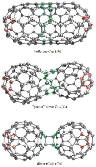 As follows from the topological calculations, the three structures have the stable central belts, i.e., the atoms that should be less reactive due to their topological embedding. They are shown in green circles in Figure 1. The corresponding nodes are characterized with minimal transmission values (Equation (3)). In contrast, maximal values () indicate highly reactive atoms (in topological sense or ‘topo-reactive’), which are highlighted with red circles in Figure 1. The values show that the dimers have very stable nodes, e.g., four sp3-hybridized carbon atoms of the cyclobutane ring bridging the fullerene cores in dimer (C60)2 (C2h). Dimer C120 (Ci) is characterized the higher values that is interpreted as the corresponding nodes are ‘topo-reactive’ working against the global molecular stability. Note that we consider topological interactions that occur at any distance in the graph, i.e., every node interacts with all the other 119 nodes.