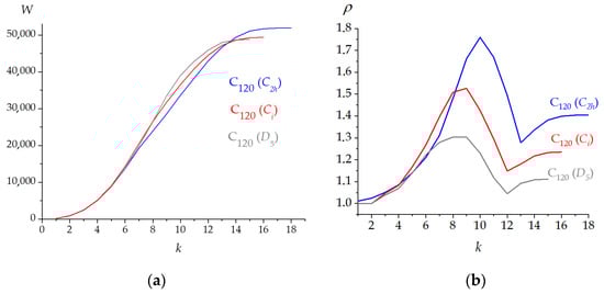For example, graph invariant W(k) in the range of k = 6, 7, ... 12, 13 (i.e., limiting the interactions from the 1st till the 6th nearest neighbors in case of k = 6 etc.) privilege the (C60)2 (C2h) dimer. Over the interaction range for k ≥ 14, the other two molecules result in more compact. Particularly, the C120 fullerene becomes the most compact at k = 3, 4, 5, and 15 (Figure 2a). Index ρ(k) shows the inversion at k = 6 where (C60)2 (C2h) emerges the most round structure whereas C120 (D5) still prevails for the other k values (Figure 2b). The present calculations show that the fullerene cage is also the roundest structure according to the ρE(k) index at any value of k.