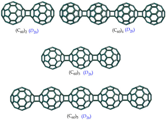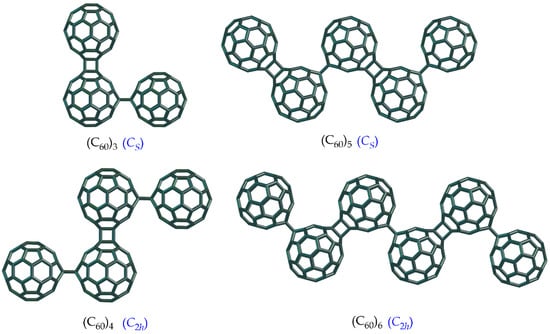 We were previously performed a DFT study of the dipole polarizability of the nano-aggregates constructed with the C60 cores connected via [2+2]-cycloadditions with all-trans-1 (linear oligomers) and all-eedge positions (zigzag oligomers) [23]. In the present work, we study both linear (n ≥ 2) and zigzag chains (C60)n (n ≥ 3) in the aspect of their topology (Figure 3 and Figure 4).