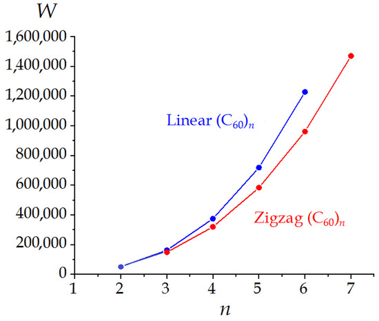 The results of the calculations are collected in Table 2 and Table 3. In general, the W values are higher for linear molecules (C60)n as compared with zigzag ones with the same n. Hence, index W differentiates with oblong (linear) and compact (zigzag) nanostructures (Figure 3 and Figure 4).