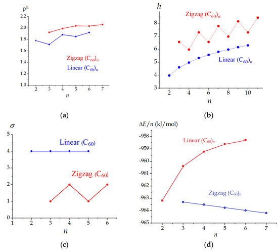 The calculations via Equations (10)–(13) are shown in Table 2 and Table 3. Similar to ρE = f(n), the view of dependences h = f(n) depends on the molecular shape of (C60)n. However, in contrast to ρE = f(n), the information entropy of zigzag oligomers is saw-like, whereas h monotonously increases with n for linear structures (Figure 6b). Herewith, more symmetric even zigzag (C60)n obtain lower h values.