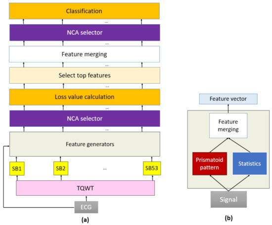 Furthermore, 40 statistical features have been utilized in this model. Textural and statistical feature extractors are very effective, but they cannot create features. TQWT [39] (an effective and third-generation transformation) has been applied to provide feature extraction at a high level. By employing TQWT [39], 53 sub-bands have been created. Our suggested/applied feature extraction functions generate features from these 53 sub-bands and the original ECG signal. Therefore, it is named PrismatoidPatNet54, and it can select the most discriminative feature vectors in the feature extraction phase. We suggested a comprehensive machine learning feature creation model, which uses neighborhood component analysis (NCA) selector [40] and support vector machine (SVM) to calculate misclassification rates of each generated feature vector [41,42]. The top 10 feature vectors are chosen and combined to generate the final feature vector by deploying these loss values. In the feature selection phase, NCA chooses the most informative 512 features. In order to show the strength of the proposed feature extraction, two shallow classifiers have been chosen: k nearest neighbors (kNN) [43] and SVM. By employing these classifiers, high classification accuracies have been attained. Briefly, the fundamental aims of PrismatoidPatNet54 are: