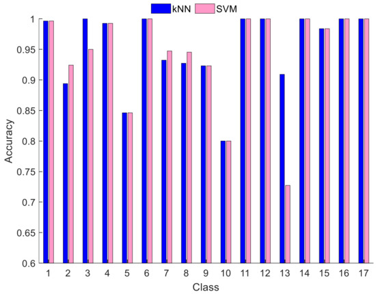 As can be seen from Figure 3, kNN attained an excellent class-wise accuracy (100%) on the seven classes (3rd, 6th, 11th, 12th, 14th, 16th, and 17th categories), and the worst class-wise accuracy was calculated as 80% on the 10th class. On the other hand, the SVM classifier yielded a 100% class-wise accuracy on six classes (6th, 11th, 12th, 14th, 16th, and 17th categories). The worst class-wise accuracy was equal to 72.73% in the 13th class. However, the overall accuracy of the SVM was 0.2% greater than the kNN classifier.