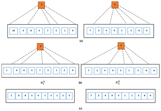 The population is initialized randomly, consisting of permutations of given customers. Each chromosome π is a random permutation of customers without trip delimiters which can be viewed as a giant tour (trip) intended for an unrestricted capacity vehicle. The total number of customers to be served is n; each chromosome π consists of a total of n genes corresponding to all given customers, and each customer appears just once in each chromosome. A typical chromosome π with nine customers representing a giant tour is shown in Figure 3a. The cluster-first, route-second method is utilized to split the giant tour into routes as per the capacity limit of vehicles, and it is followed by appending the central node 0 (), as depicted in Figure 3b. The corresponding graphical CVRP is given in Figure 3c.