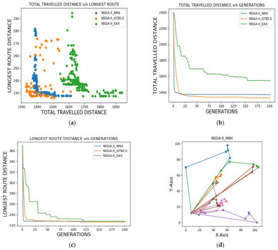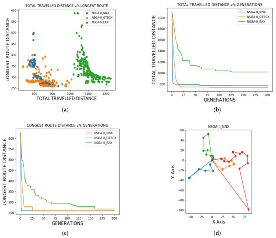 As can be observed, the overlapping of routes is minimal in the best solution provided by NSGA-II_GTBCX, while overlapping is maximal in the best solution given by NSGA-II_EAX. For CVRP instance A-n48-k7, the total travelled distances offered by NSGA-II_NNX, NSGA-II_GTBCX, and NSGA-II_EAX are 1431, 1074, and 1144, respectively. The lengths of the longest routes offered by the three versions are 210, 204, and 243, respectively. The NSGA-II_GTBCX offers the best values among the three versions of NSGA-II. However, the distance travelled for the best-known solution is 1073, but this solution is optimized in the context of the single objective optimization method, which does not consider the other objectives. Figure 7 shows the solutions offered by NSGA-II_NNX, NSGA-II_GTBCX, and NSGA-II_EAX for CVRP instance P-n55-k7. As depicted by Figure 7a, all Pareto solutions offered by NSGA-II_GTBCX completely dominate all solutions offered by NSGA-II_EAX. On the other hand, some Pareto solutions of NSGA-II_GTBCX completely dominate all the solutions of NSGA-II_NNX while there are very few solutions of NSGA-II_NNX which dominate the worst Pareto solutions offered by NSGA-II_GTBCX. Figure 7b,c show the total travelled distance and the route with the largest distance after 200 generations, and it can be observed that NSGA-II_GTBCX offers better values for both objectives. Figure 7d–f depict the best routes offered by NSGA-II_NNX, NSGA-II_GTBCX, and NSGA-II_EAX, respectively.