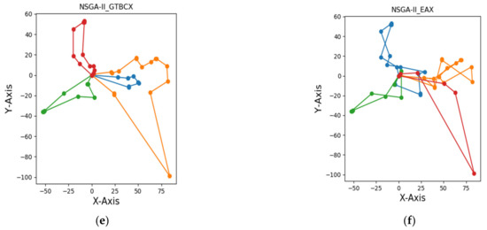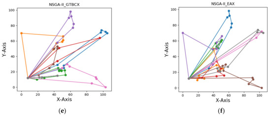 For CVRP instance A-n48-k7, Figure 6a shows the Pareto solutions offered by NSGA-II_NNX, NSGA-II_GTBCX, and NSGA-II_EAX. All Pareto solutions offered by NSGA-II_GTBCX dominate all Pareto solutions offered by NSGA-II_EAX. However, there are very few solutions offered by NSGA-II_NNX that dominate the worst Pareto solutions offered by the proposed NSGA-II_GTBCX. However, there are some solutions offered by the proposed NSGA-II_GTBCX that completely dominate all solutions of NSGA-II_NNX. Figure 6b,c show the total travelled distance and the length of the longest route for 200 generations, and it can be observed that NSGA-II_GTBCX offers better values of both objectives. The best routes offered by NSGA-II_NNX, NSGA-II_GTBCX, and NSGA-II_EAX are depicted in Figure 6d–f, respectively.