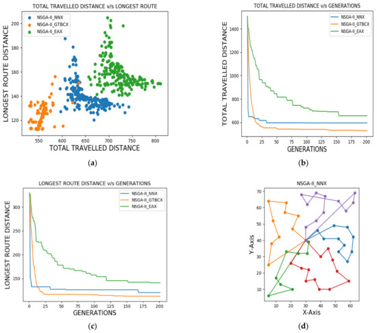 However, the lengths of the longest routes offered by the three versions are 105, 99, and 134, respectively. For CVRP instances B-n50-k8, E-n51-k5, and F-n45-k4, the solutions offered by NSGA-II_NNX, NSGA-II_GTBCX, and NSGA-II_EAX are provided in Figure 8, Figure 9 and Figure 10, respectively, and it can be seen that the behaviour of these three versions of NSGA-II for the three CVRP instances is almost similar as for the CVRP instances A-n48-k7 and P-n55-k7. As observed from Figure 8a, Figure 9a, Figure 10a, the Pareto solutions offered by NSGA-II_NNX and NSGA-II_GTBCX dominate the maximum Pareto solutions offered by NSGA-II_EAX. However, some of the worst Pareto solutions offered by NSGA-II_GTBCX are dominated by the best solutions offered by NSGA-II_NNX. For the total travelled distance and the length of the longest route, NSGA-II_GTBCX consistently offers better values of both objectives in comparison to NSGA-II_NNX and NSGA-II_EAX. The route overlapping is minimal in the best solution provided by NSGA-II_GTBCX, while it is maximal in the best solution given by NSGA-II_EAX.