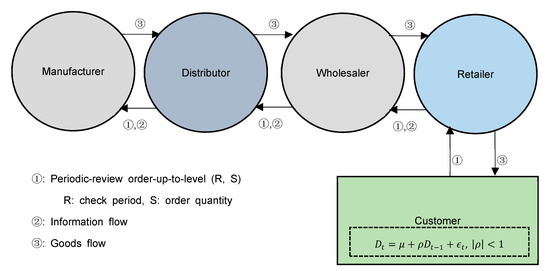The supply chain model targeted in this study consists of a manufacturer, distributor, wholesaler, and retailer, as shown in Figure 1, and receives orders from the customer.