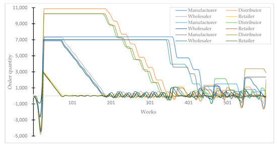 The data used for machine learning use order information of manufacturer, distributor, wholesaler, and retailer included in the supply chain model in Figure 1. By a customer order assuming AR(1), the sum of the customer order quantity and the predicted order quantity to prevent backlog is sequentially requested from the retailer → wholesaler → distributor → manufacturer, and the produced order quantity is delivered by the manufacturer → distributor → wholesaler → retailer and delivered to the final customer. Figure 2 shows an example of the trend of change for three sets of order data for manufacturer, distributor, wholesaler, and retailer.