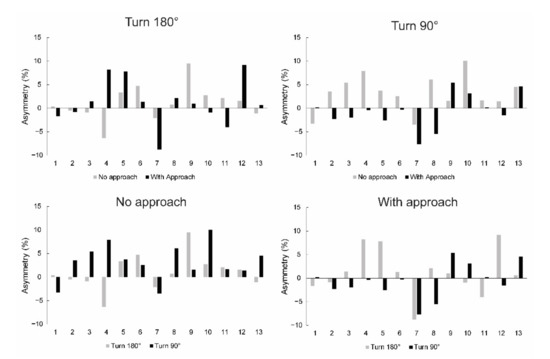 Figure 1 shows the individual inter-limb asymmetry scores across the participants. Comparing the tasks with the same angle with and without the approach, the agreement in terms of inter-limb asymmetry direction was relatively limited (7/13 (53.8%) matching for 180° turn; 5/13 (38.4%) matching for 90° turn). Slightly better agreement was shown between the 180° turn and 90° turn matching for tests without approach (8/13 (61.5%), but even poorer for the tests with approach (4/13 (30.7%) matching).
