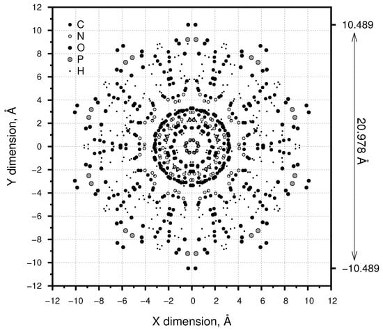 This produces a Protein Data Bank (PDB) file containing the atomic co-ordinates of B-DNA, with a twist of 36.0 and a rise of 3.375 Å (1 Å = 0.1 nm) each base pair, for five repetitions of the artificial base sequence adenine, thymine, cytosine and guanine (ATCG), chosen to average out any variations in the structure that occur with non-random base sequences and consequent slight variation in electrostatic forces [,,]. Twenty repetitions of the ATCG sequence were used for the axial view shown in Figure 2 and five for the linear view (shown in part in Figure 3). PyMOL version 1.8.6.0 [] was subsequently used to visualise the molecule.
