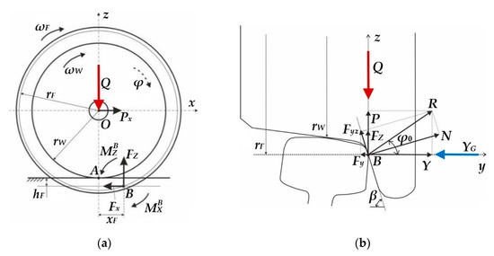 where is the sum of the forces acting on the wheel along the axis Oz and is the sum of the moments of the applied forces about the flange contact point B.