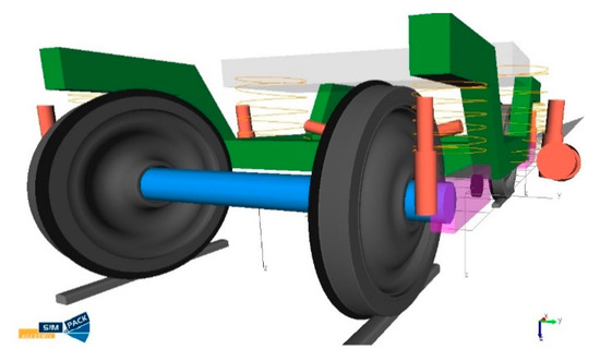 In the next step of the research, a multibody model of a railway wagon bogie was created. The multibody model was set up in Simpack software (Dessault Systèmes, Velizy-Villacoublay, France). This software is a commercial multibody simulation software used for simulating non-linear motion of large and complex multibody systems. Parameters of the bogie correspond to a passenger railway wagon and the main data are listed in Table 1 and Table 2.