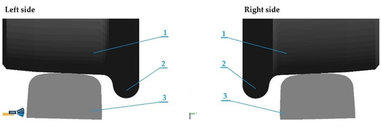 The detail of the wheel/rail interface of the created multibody model: 1—a wheel tread, 2—a wheel flange, 3—a rail.